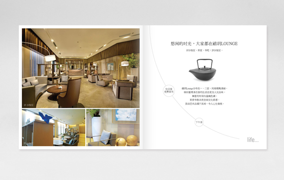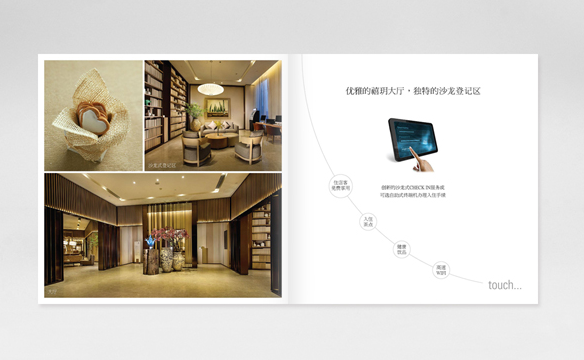 基本上,高端酒店宣传册的每一页都是左边为图片,右边为文字介绍,并且都具有设计特点,例如,通过介绍酒店的某间特色房间,向客人介绍这个房间的人性化设计是怎么样。